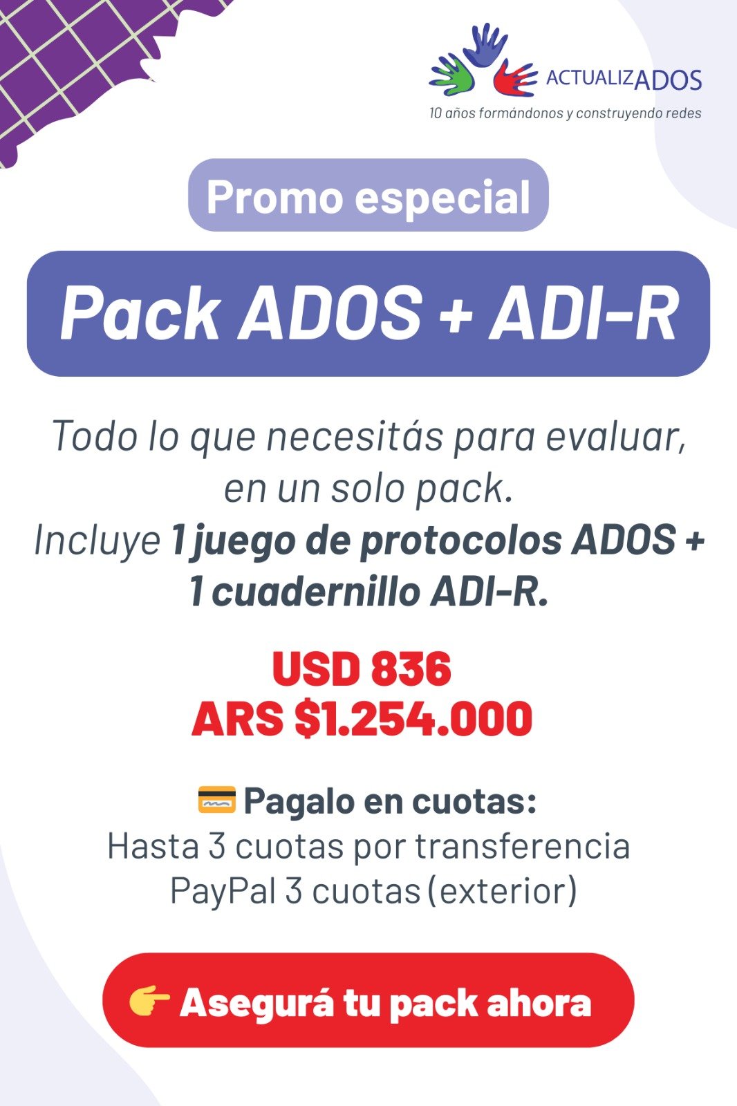Con manual: $990.000 en 6 cuotas o $841.500 en un pago por transferencia (incluye un juego de protocolos de evaluación original)
